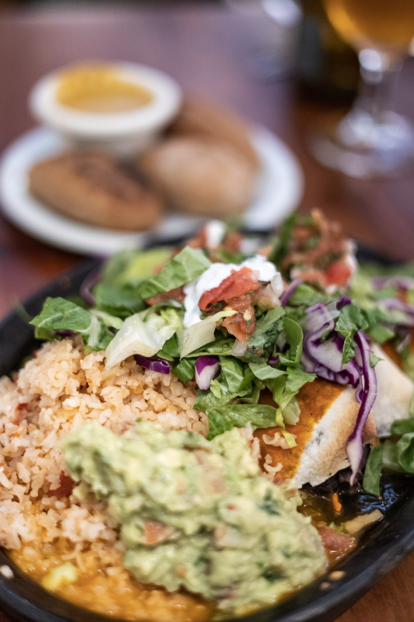 Nos sentamos y nos atendieron rápidamente, pedí recomendación de la carta porque ya saben, veía todo verde, así que me recomendaron el «nuevo méxico». Y estaba exquisito, unas tortillas con queso, porotos, arroz, lechuga, tomate, guacamole, etc. etc. etc. ¡Buenísimo! Ni me acordé de la carne. También me tomé un jugo de piña jengibre y perfecto.