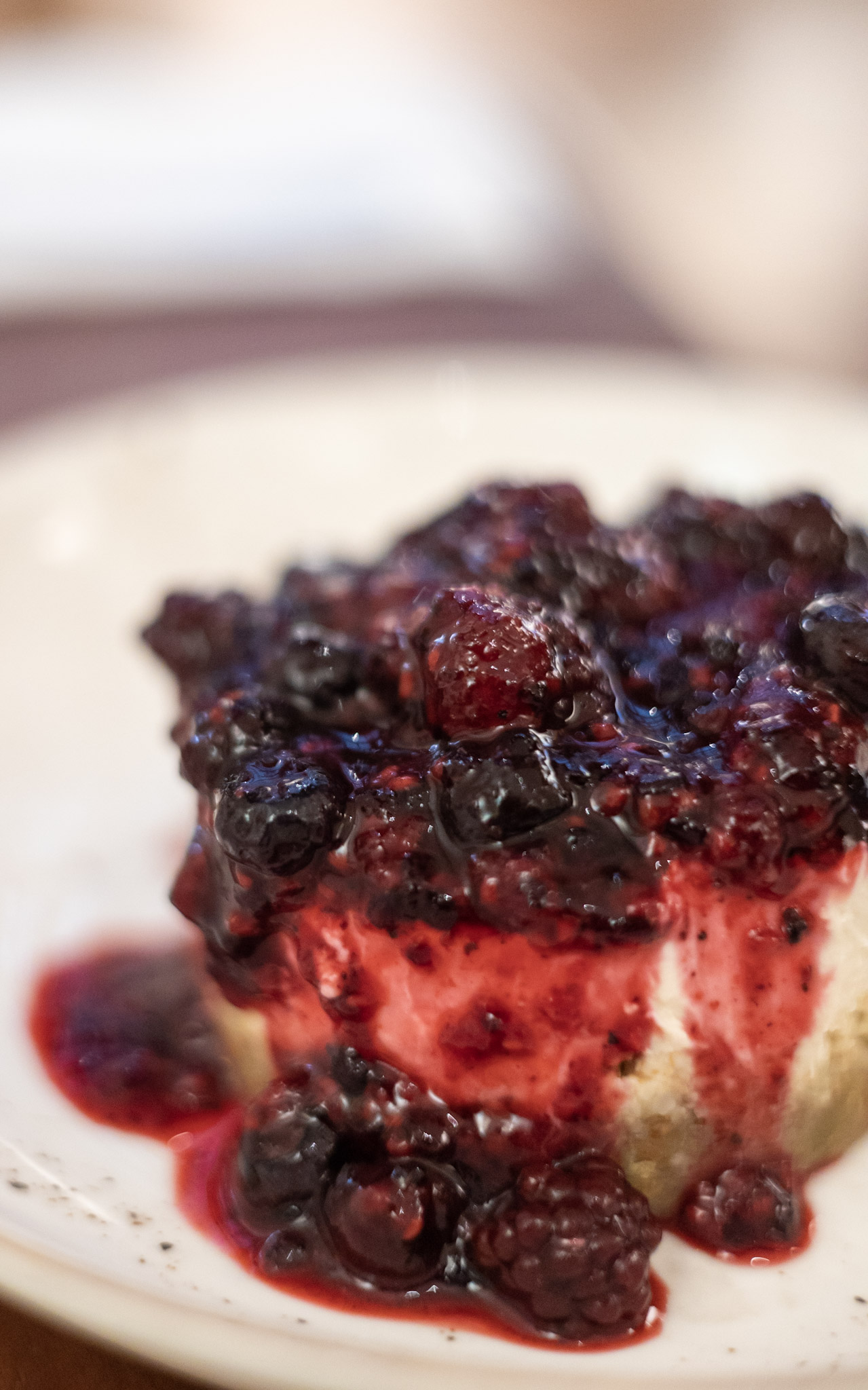 De postre, tenían hartas cosas que me hubiera gustado probar, pero elegí los panqueques con helado. Y la tocaya probó un cheesecake de frutos rojos. Todo muy rico y nada hostigosos, la verdad es que muy bien. Encontré que a pesar de lo lleno que estaba, la atención fue buena y la comida excelente.