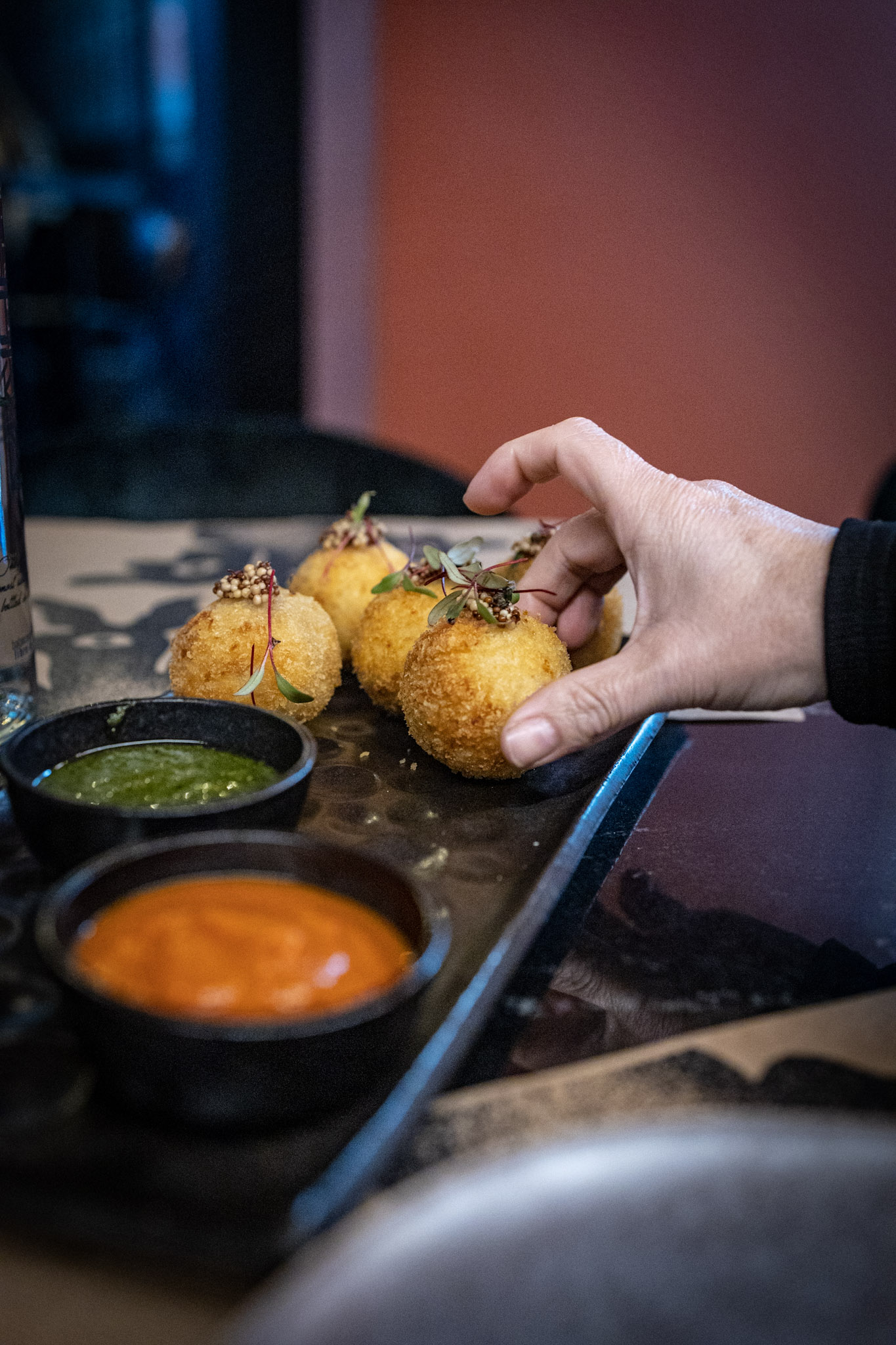 Hay un segundo piso en donde también hay mesas, y hay mesas en el «patio de afuera», lo bueno también es que te puedes sentar en la barra porque hay espacio. PERO recomiendo que pidan reserva porque este lugar se va a rellenar. Y esto es porque la atención es buenísima, Fabián estuvo con nosotras aconsejándonos en los platos de la carta. Hay platos que pueden ser veganos o no y eso en estos momentos hace la diferencia. Los cocteles muy bien preparados, bien de dulzor, de amargor, las mezclas muy buenas y la decoración interesante.