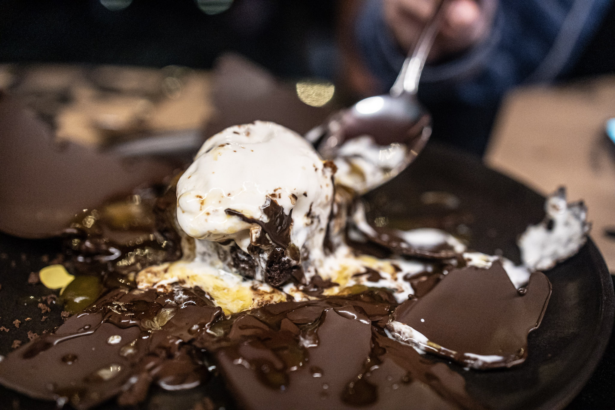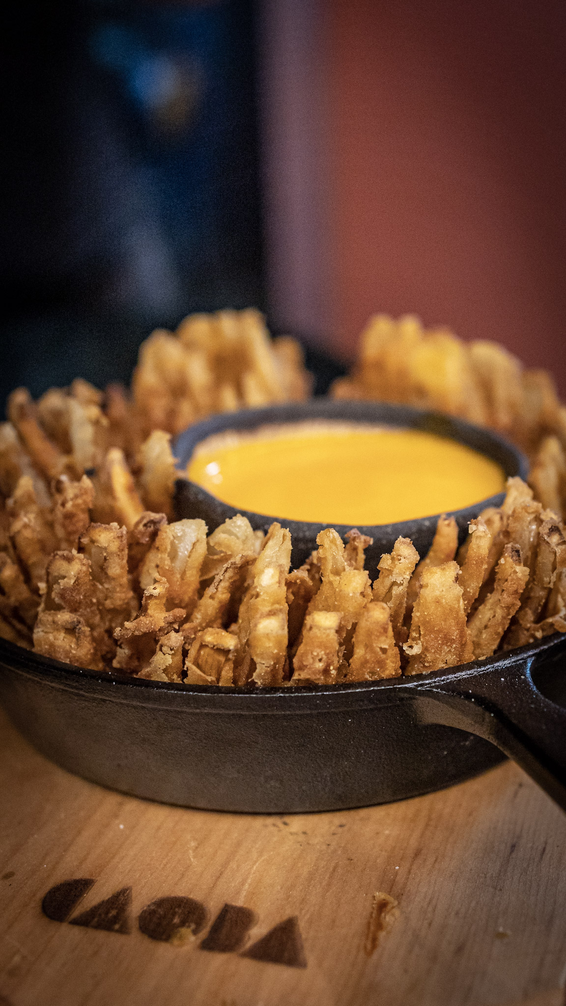 Me interesó mucho probar la «Blooming onion» o -flor- de cebolla apanada y frita, porque siempre la veia en youtube o en instagram y justo la tenían en la carta. También me sorprendió que tuvieran hummus o babaganoush, así que también pedimos para probar. Y lo mejor de lo mejor fue el postre, pidanlo! esa mezcla del brownie con la salsa de maracuya y mango quedó perfecta porque no te queda ese sabor dulce y pesado a veces de los volcanes de chocolate.