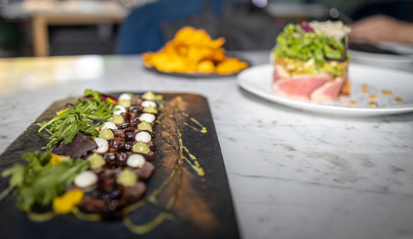 Partimos por dos cócteles que llevan harto tiempo en la carta: un Siempreverde (gin+chaartreusse) y un San Marcial (mezcal) y con eso nos trajeron un Tartar de Atún acompañado con unas papas fritas y un Tataki de Res con salsa Tonkatsu. Los dos platos no necesitan nada extra, todo está bien, la mezcla de sabores, y las texturas.
