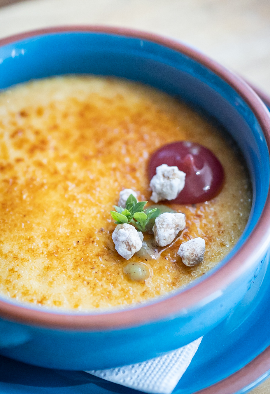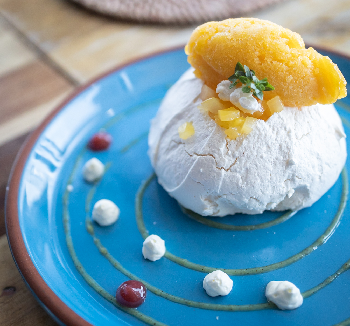 De postre, pedimos un creme brûlée y una pavlova de papaya.