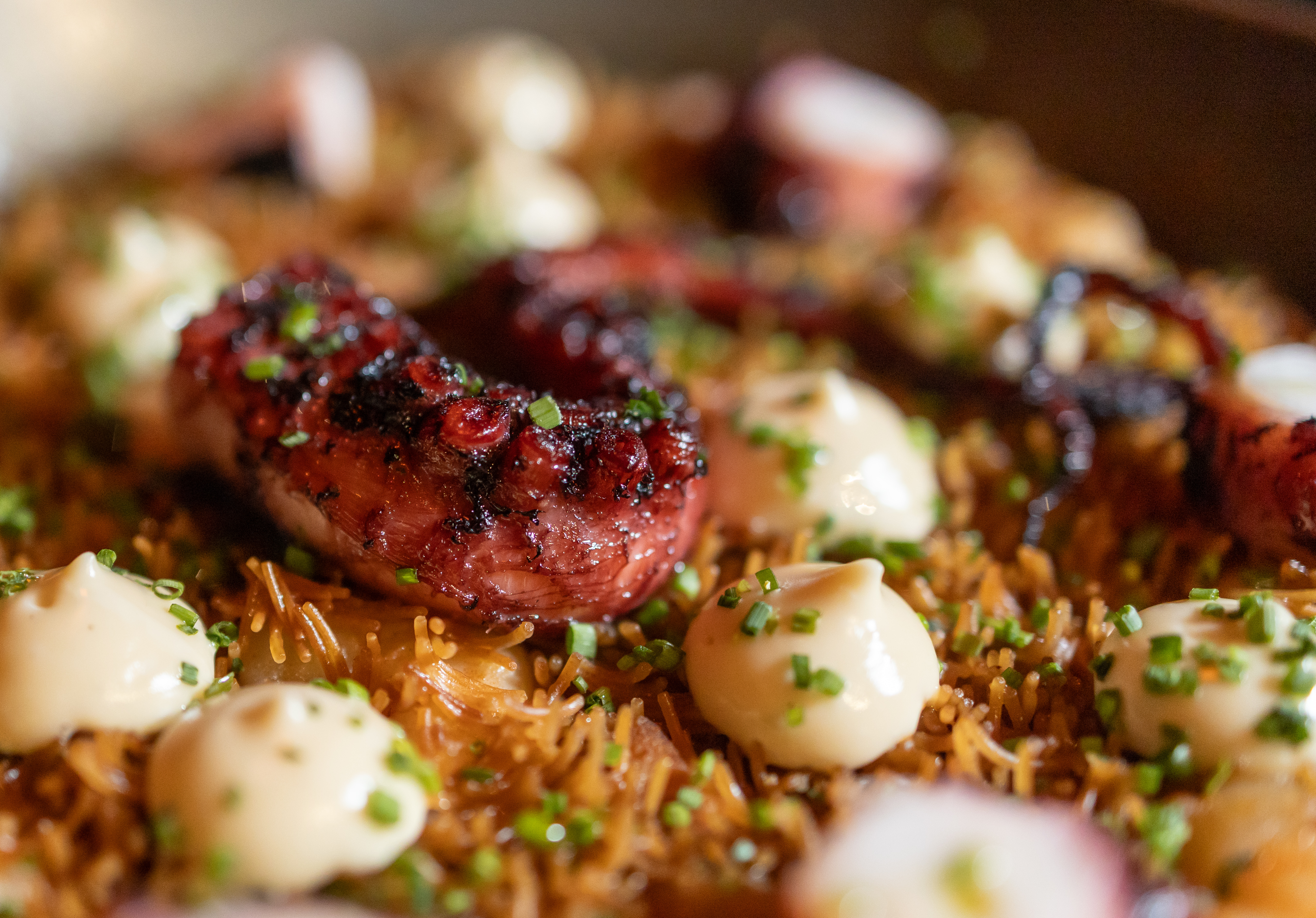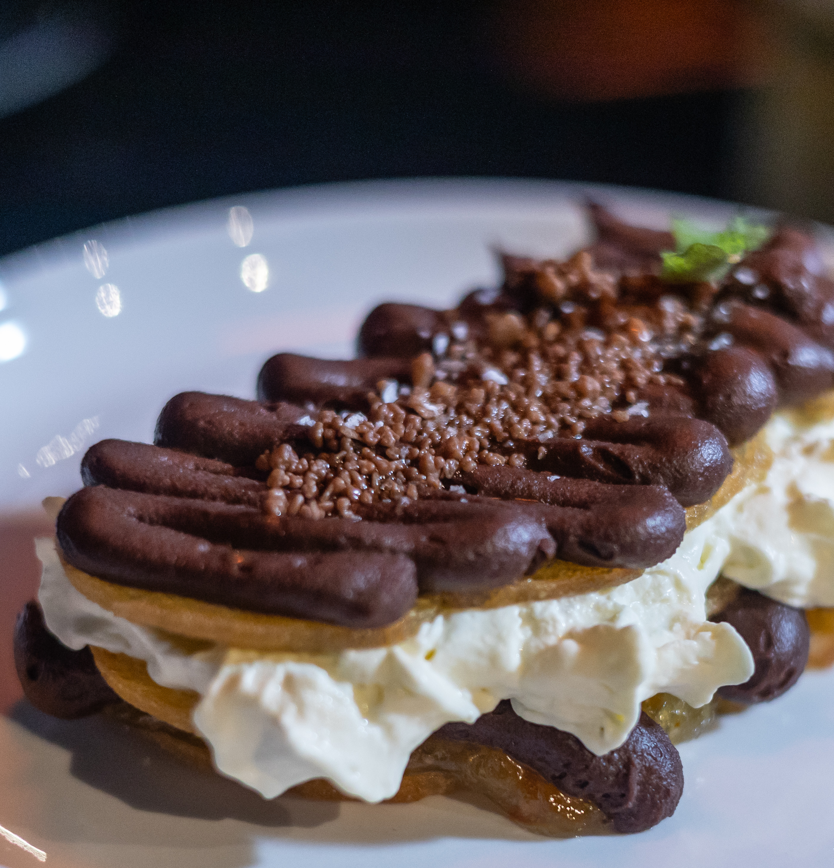 Por lo de las tapas y los platos de comida, llegó el Chef Leonardo Valls, y realmente agradezco haber probado esas patatas bravas, tan cremosas pero crujientes, tanto que escuchas el crunch. Y ese alioli junto con la salsa brava que pica pero no tanto. Son adictivas. Y dentro de todo lo probado, la verdad es que la sazón que tiene, y la pasión con la que nos contaba lo que ha hecho, se ve, se saborea, se siente y eso hace querer volver muchas veces más, y no solo por la vista. Por último, recordé ese postre de chocolate, que tiene mermelada de naranja y crema, pero encima tiene petazetas y que buen cierre para ese día. ¡Aplausos!