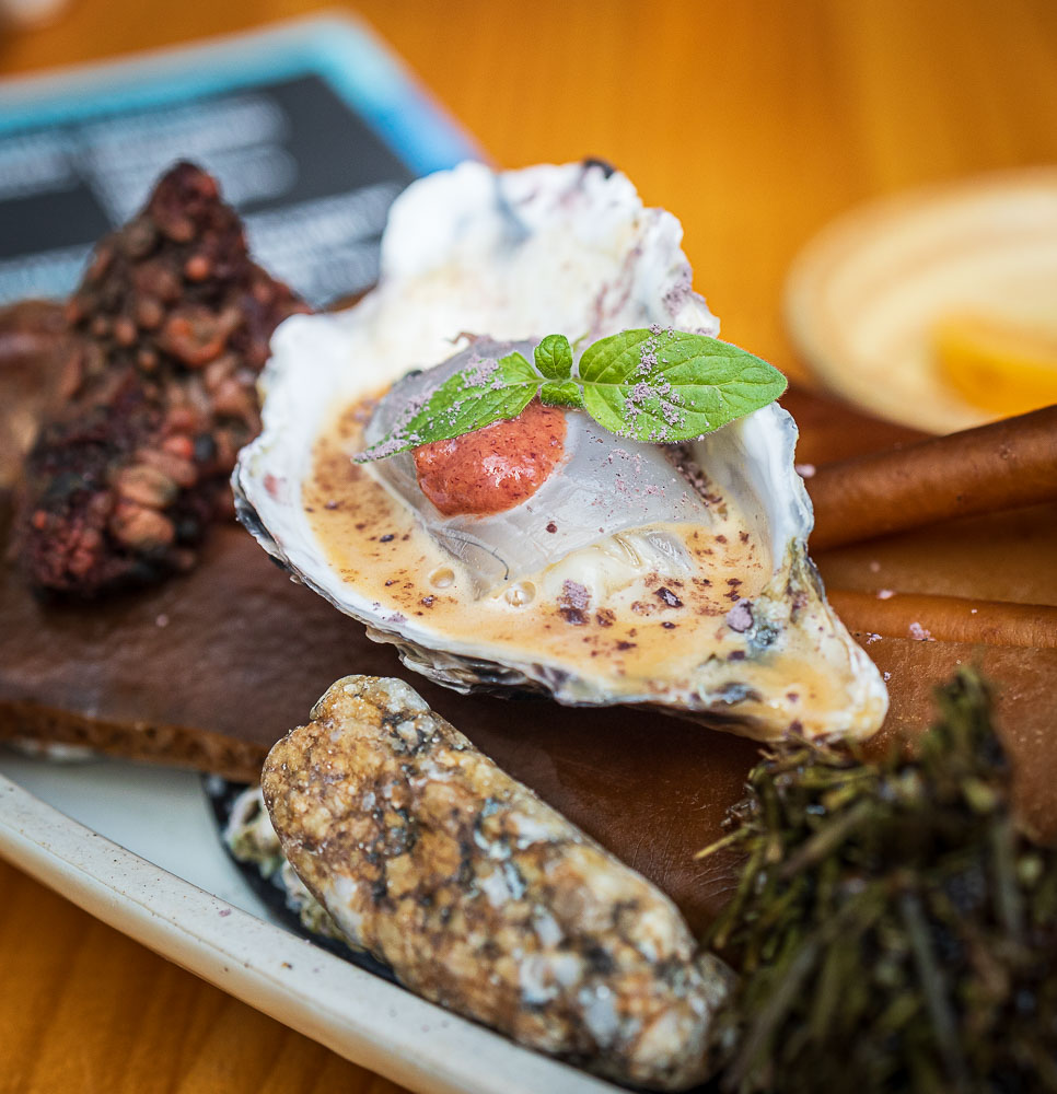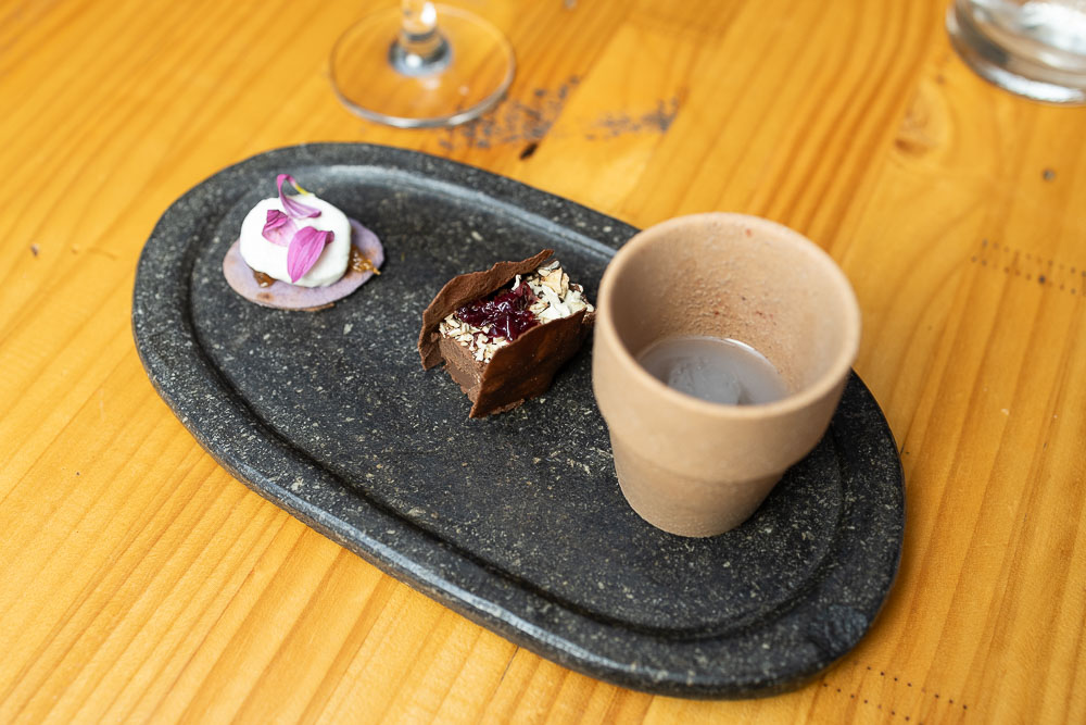 Pude saludar a Dante en la puerta, luego a Martín y conocí a Benjamín, ya estaban listos para armar el primer cóctel de la noche, un spritz (not another spritz), que funcionaba perfecto con los tres primeros platos de la noche. Varios sabores interesantes como el ácido del lulo, dulce del st. germain, maderoso del té, el picor del aji y un poquito de astringencia por el espumante y té. Era para tomarse 2 copas fácilmente.