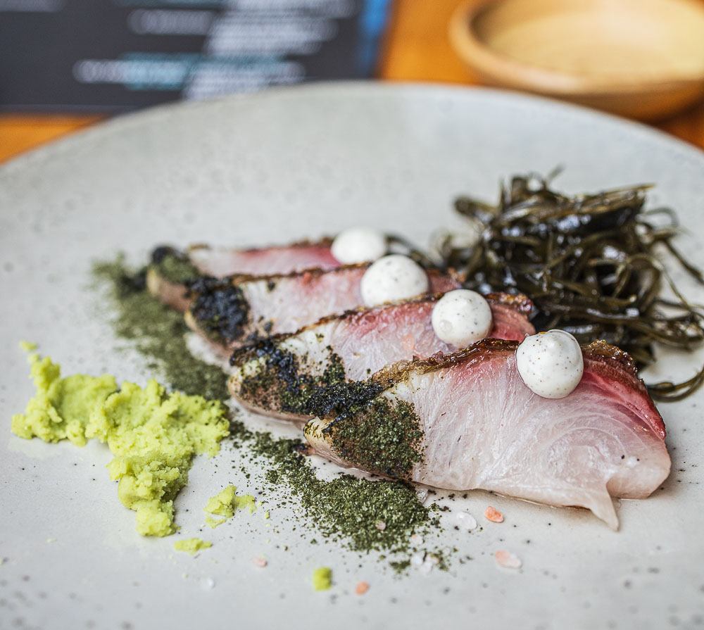 Segundo: un sashimi de hiramasa madurado, bajo el mando de Juan Osaki, que se le agregó un punto de lactonesa trufada, wasabi, kombu en juliana y vinagre con dashi. Este plato era esperado por mi y por la publicación que se había subido en el instagram de SNK17