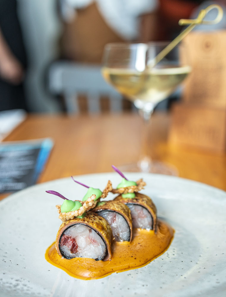 Un intermedio: un hermoso maki con pescado curado y farsa de camarón. Exquisito. Y servido también con el Olivette, un cóctel de Pana Juanzzzzz, bien dirty… Vermut, Gin, St. Germain y Salmuera de Aceitunas. Un agridulce entretenido.