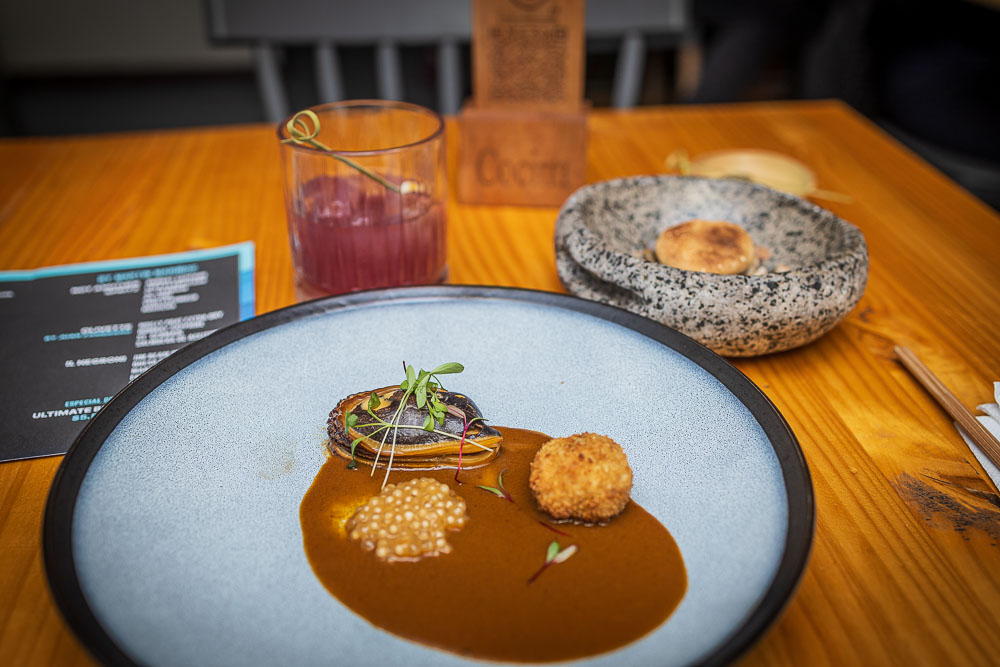 Para el segundo fondo, llegó el encocado de cangrejo y arepa de mote de John Herrera y este plato iba perfecto con Il Negroni (que en verdad debería haber sido Il Boulevardier). Esta mezcla contenia whisky cocinado con queso grana padano, los frutos del bosque se cocinaron con azucar y canela, y al final se mezcló todo con martini bitter y vermut. El garnish fue un pedazo de queso fresco. Un cóctel con permanencia en boca, y empezaba dulce para seguir con el sabor al queso, luego vermut y terminaba con el amargo del martini bitter y el picor del whisky. Una sorpresa y muchos aplausos (ustedes ya saben que no me gusta lo amargo, pero, los sabores logrados acá fueron impresionantes). Por el encocado, había que comer en conjunto todo: choro maltón, arepa y croqueta de jaiba, porque los sabores de la croqueta eran muy fuertes, junto con el choro, y la arepa equilibraba todo. El boulevardier ayudaba a limpiar y refrescar la boca de esos sabores profundos. Así que bien elegido todo.