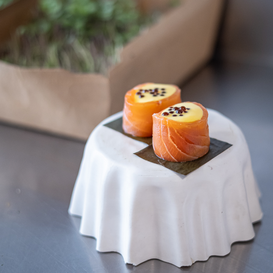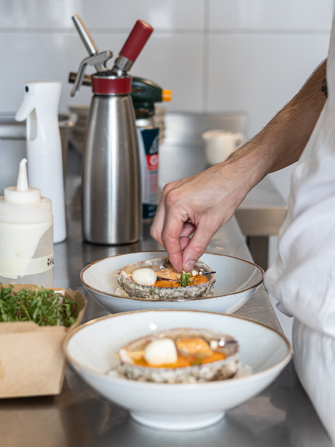 El equipo de cocina siempre atento a las indicaciones del chef, escuchando los famosos «oído chef!» – «voy atrás» – «en espera», todo funcionando como reloj cuando empezaron a llegar las primeras parejas. Las indicaciones eran directas en esa cocina zigzagueante. Los 34 grados se sentían, pero la concentración era máxima. Las primeras preparaciones se iban montando en diferentes formatos, mientras el servicio en la sala servia los líquidos, en específico los vinos que acompañaban este recorrido marino.