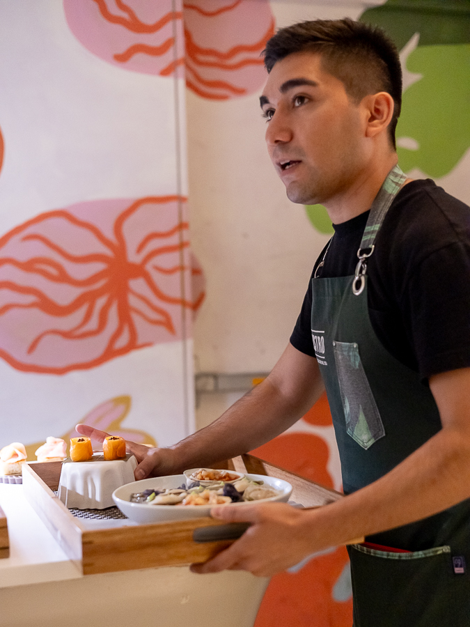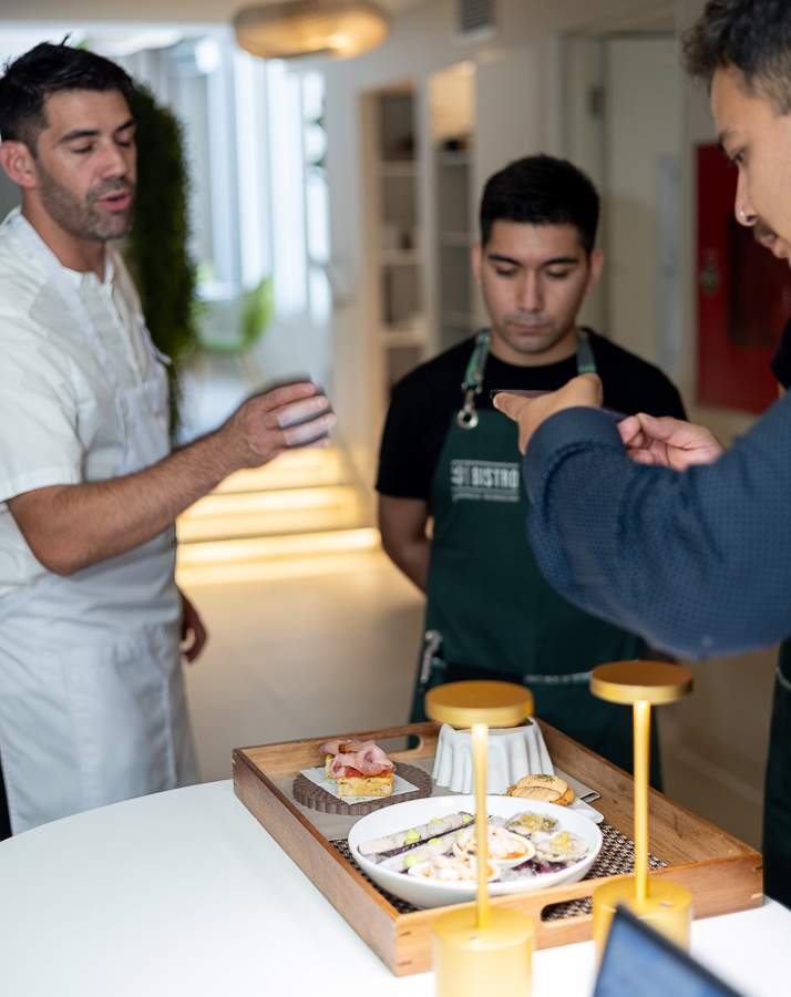 El chef salia a explicar cada plato terminado en el mesón principal, para que los garzones pudieran contar la historia de lo que se quería presentar en cada creación culinaria. Y ellos aprovechaban de tomar fotos, aclarar dudas y recordar en voz alta lo comentado.
