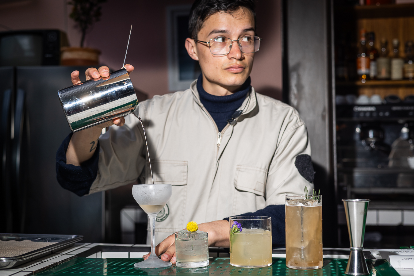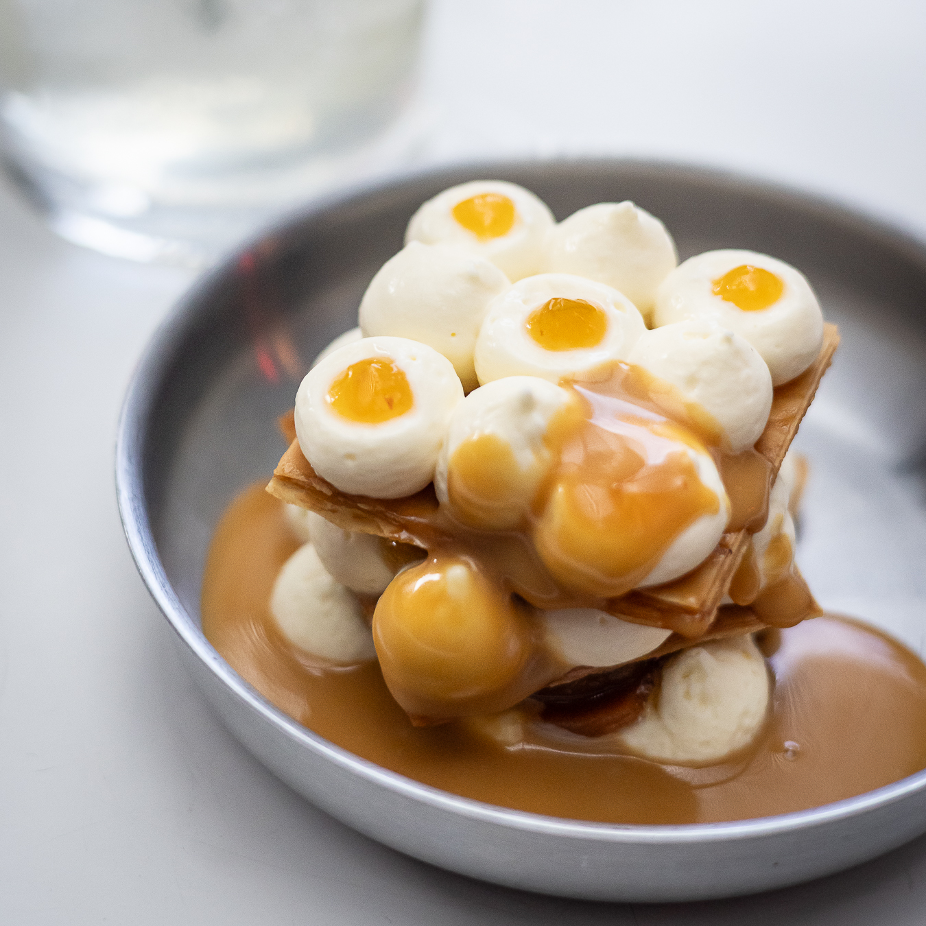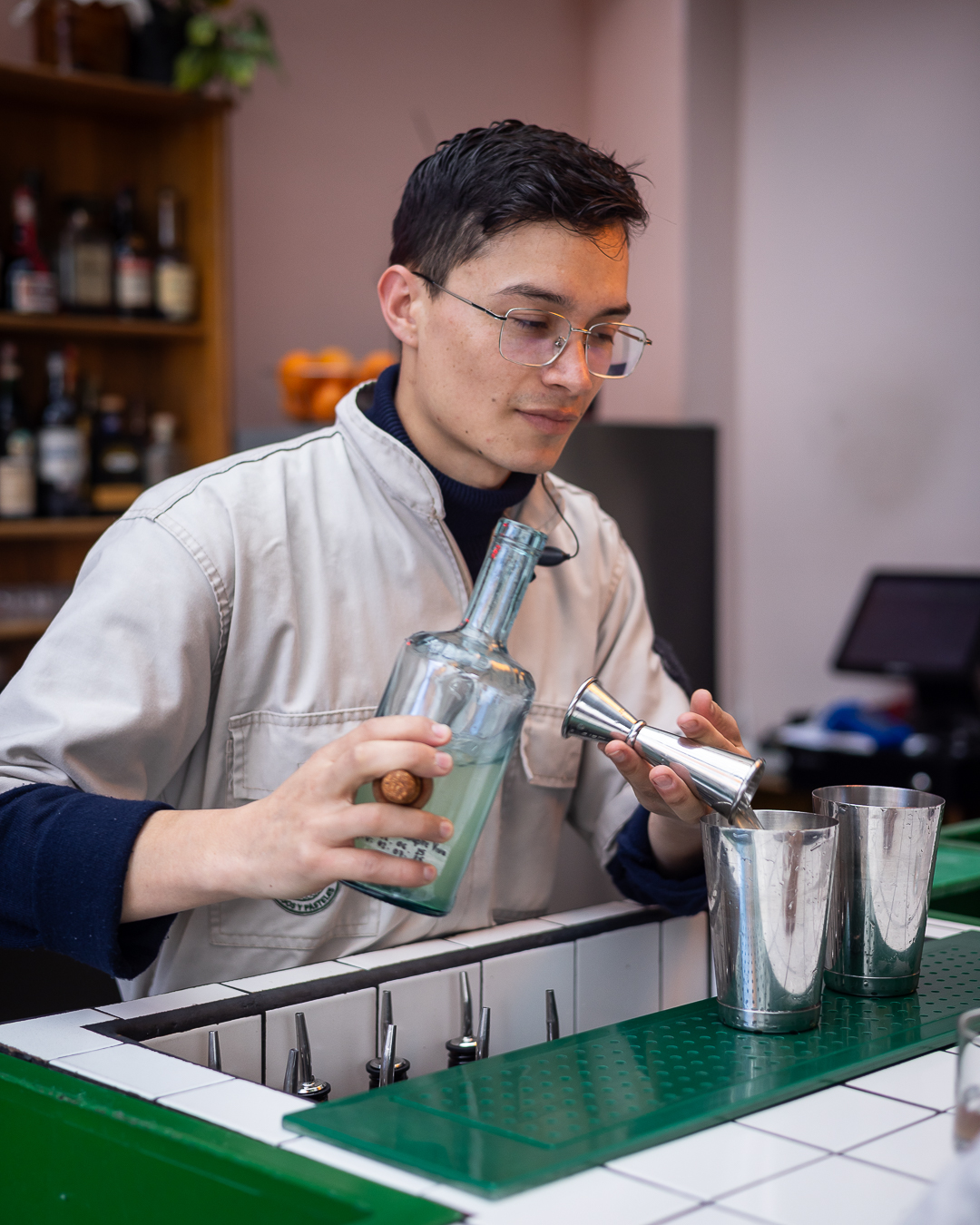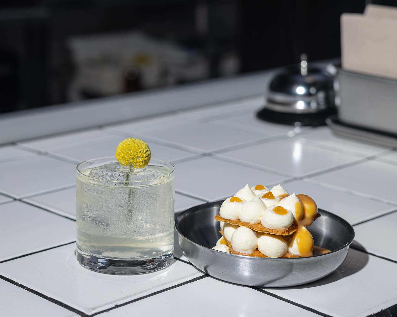 Conversando un poco con Alexander llegamos a ciertos sabores que pueden combinarse muy bien y mejor aún con diferentes pasteles, dulces, etc. sin perder el sabor del destilado. Me hubiera encantado profundizar más sobre las mezclas que realizan en ese lugar pero traté de elegir el maridaje que más calzaba conmigo: el maridaje tres: Mil Hoja y Oleoso (gin, jarabe de sol -caléndula- y vino blanco). Un cóctel suave, con un dulzor elegante y ese ácido necesario para combinarlo con el postre de mil hojas que no estaba tan empalagoso y de una textura perfecta.