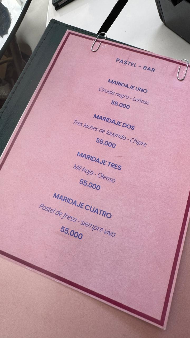 En este lugar tienen un anexo a la carta en donde ya te dejan 4 opciones de maridaje perfecto por $55.000 pesos colombianos (aproximadamente $12.500 pesos chilenos): un cóctel, un pastel y un jardín con bonsais.