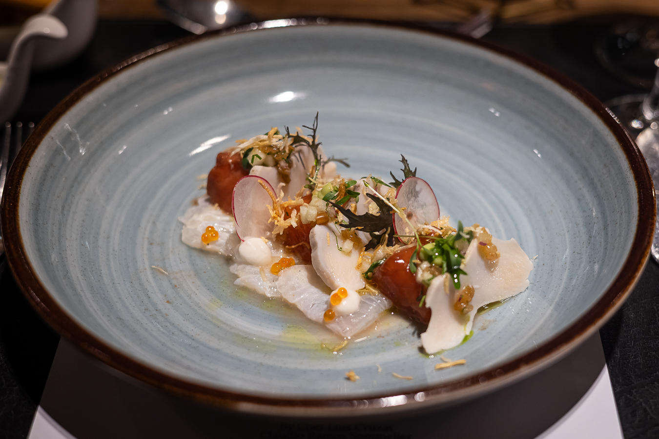 En el 2023 entró al Best Western Premier Marina Las Condes como Chef Ejecutivo y arma diferentes estilos de banquetes, cenas y otros en torno a la comida chilena y la relación con el vino (como me contó unos días atrás). Lo que me gusta de Luis es que a pesar de estar en la alta cocina hotelera, nunca olvida de dónde viene (Talca). Siempre lo verás usando y destacando productos chilenos, pero con esa elegancia y técnica internacional que solo dan años de experiencia, así como lo hizo para la cena en su nombre y que quiso participar, porque afirmó que eso es lo que más le gusta y expresa su cariño en la comida. También estuvo Claudio Ramos, sommelier del Club Placeres, apoyando en el maridaje de los platos presentados.