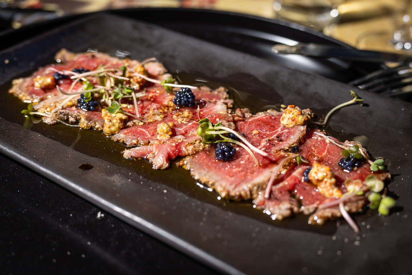 Comenzamos por un carpaccio de roast beef maridado con un espumante Vado Extra brut de la Viña Luis Felipe Edward.