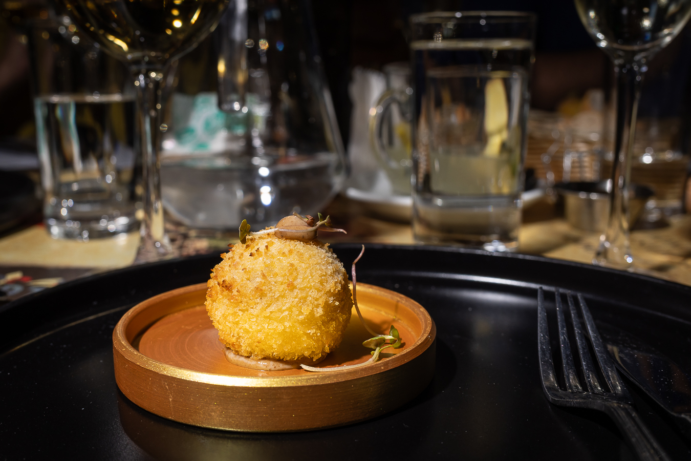 Luego una croqueta de pato trufada con alioli de ajo negro con un T.H Rarities Riesling/Sauvignon Gris de la Viña Undurraga.