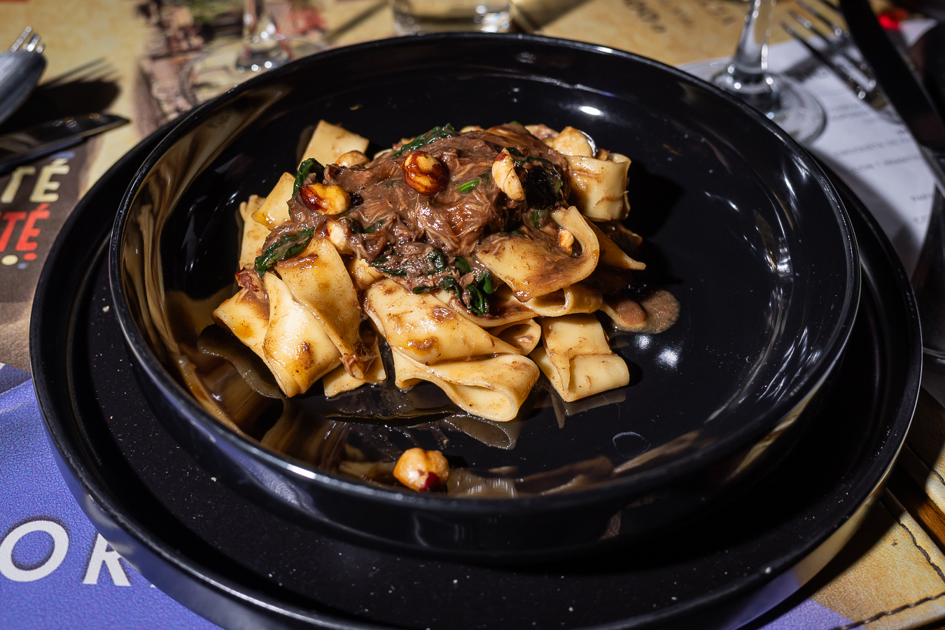 Continuamos con un papardelle con ragú de conejo, espinaca y avellanas y La Chere Noir, AOP Cotes de Rhóne Villages