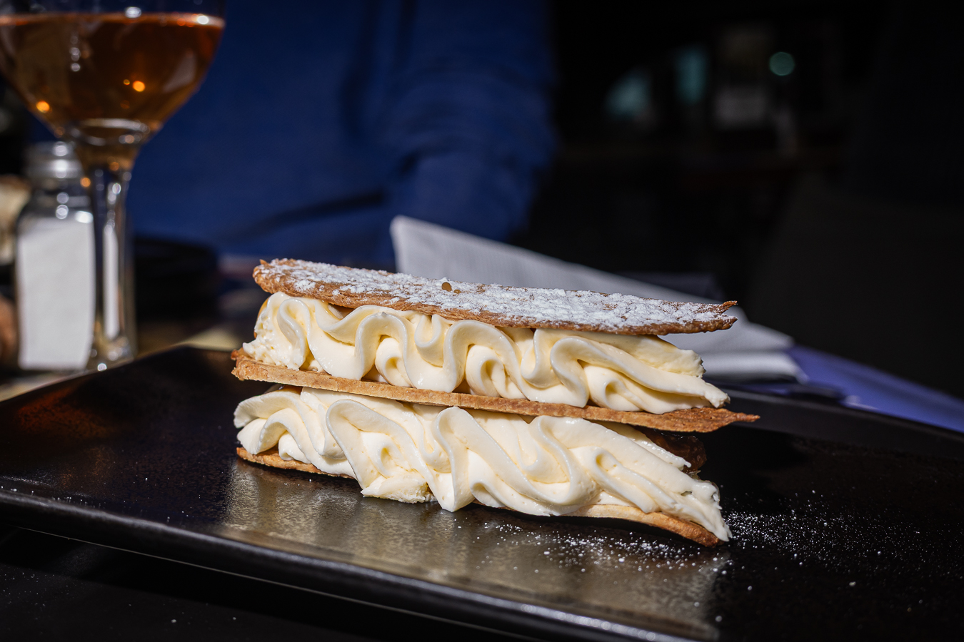 Y para terminar un postre, la torta mil hoja Normandie junto con Pequen Syrah Dulce de la Viña Arnau Faupin
