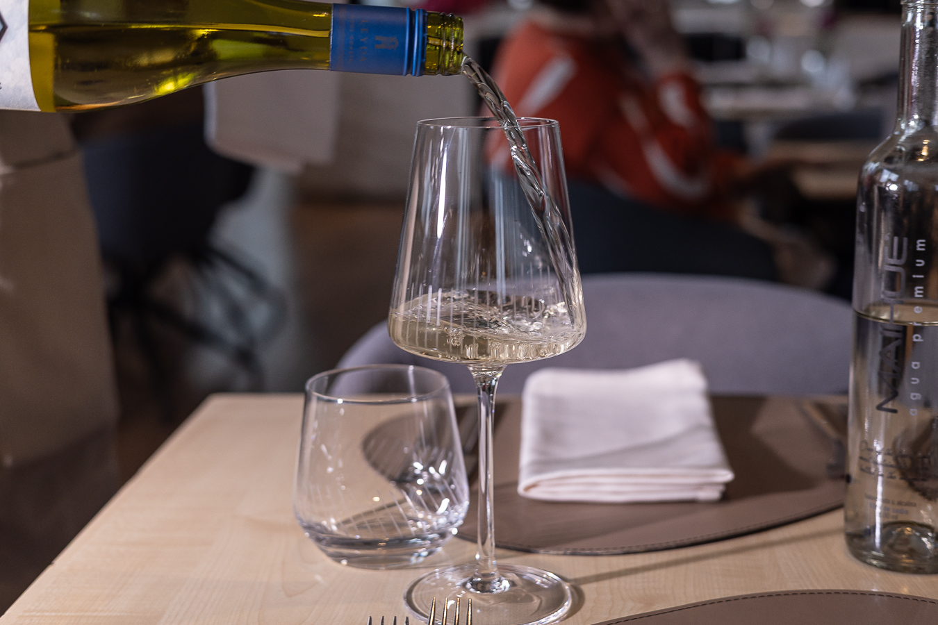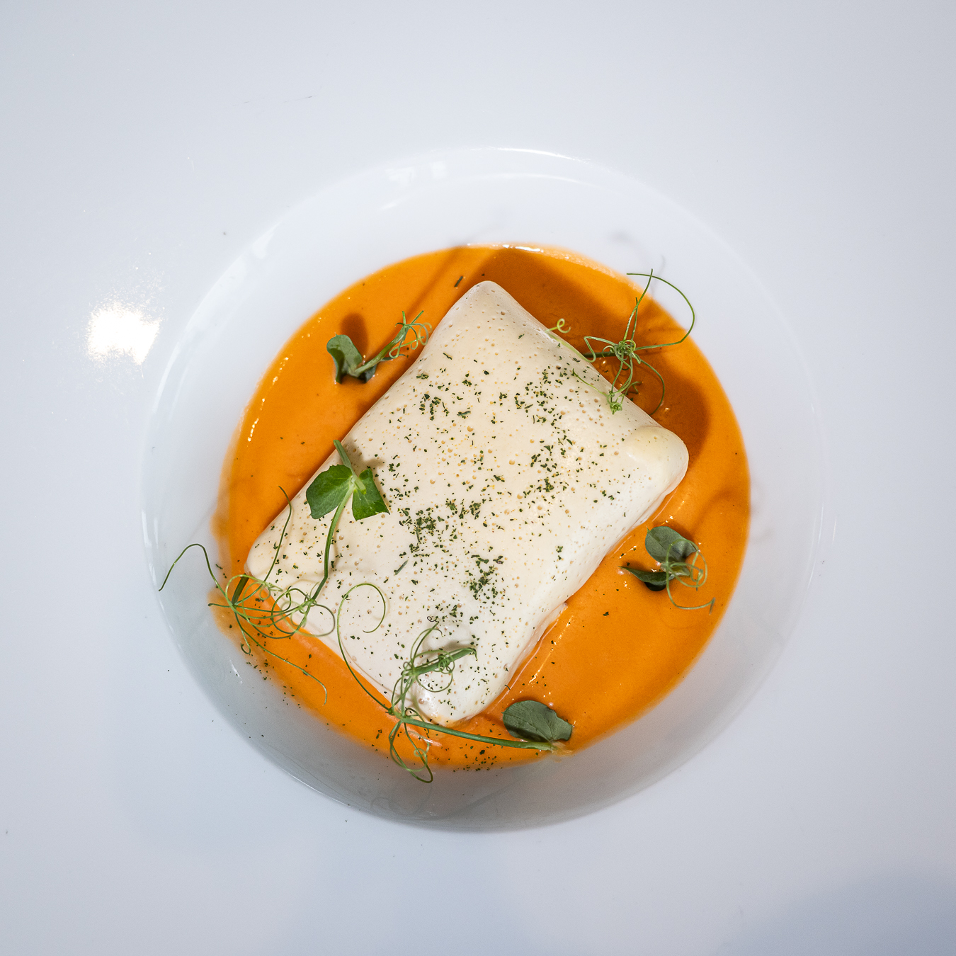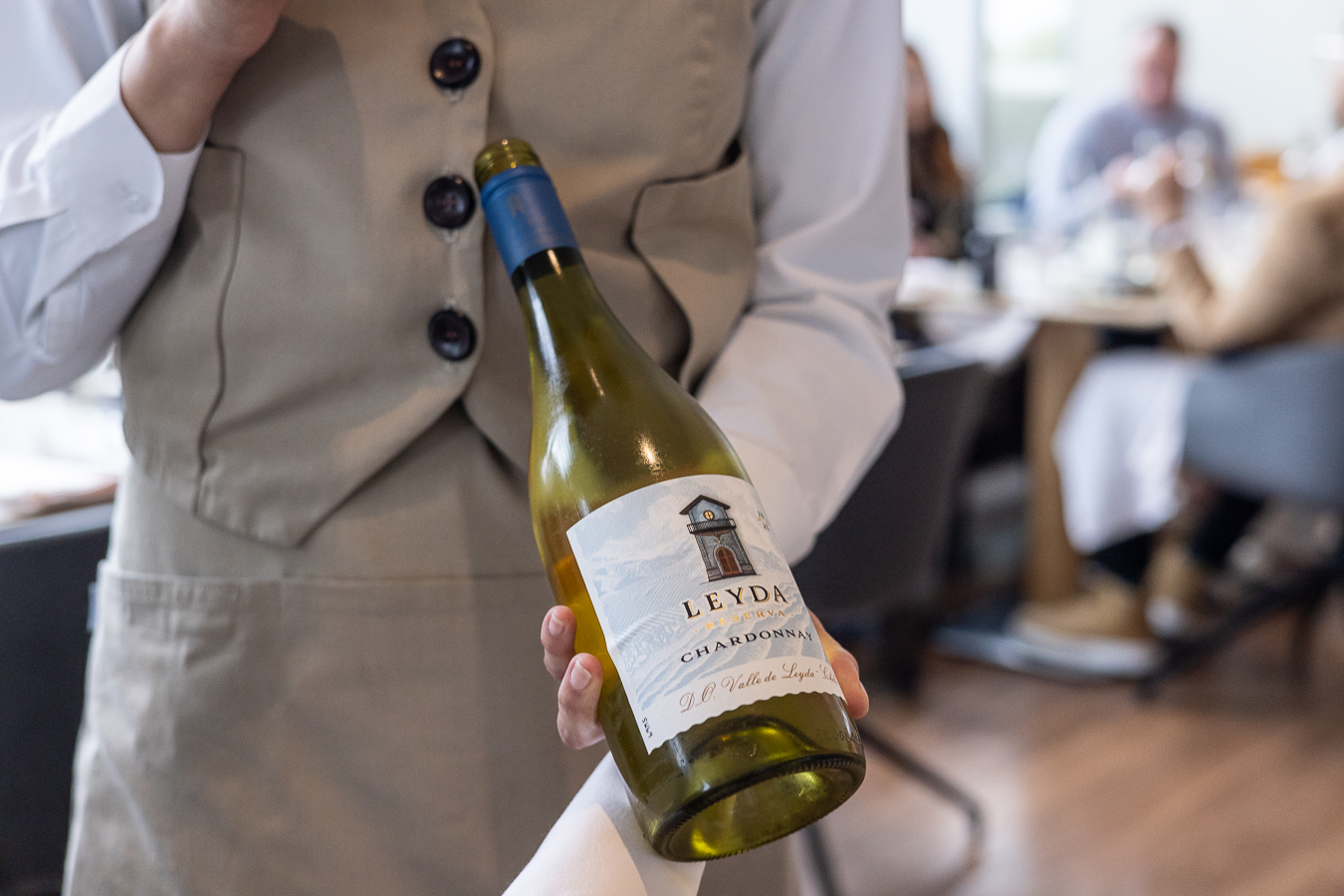 Para las entradas, compartimos un chardonnay de Leyda y las dos opciones en carta: Papa rellena con jaiba y salsa tártara con una sopa fría de tomates; y también un aguachile de bonito curado y camarón con unos encurtidos de pepino y menta.