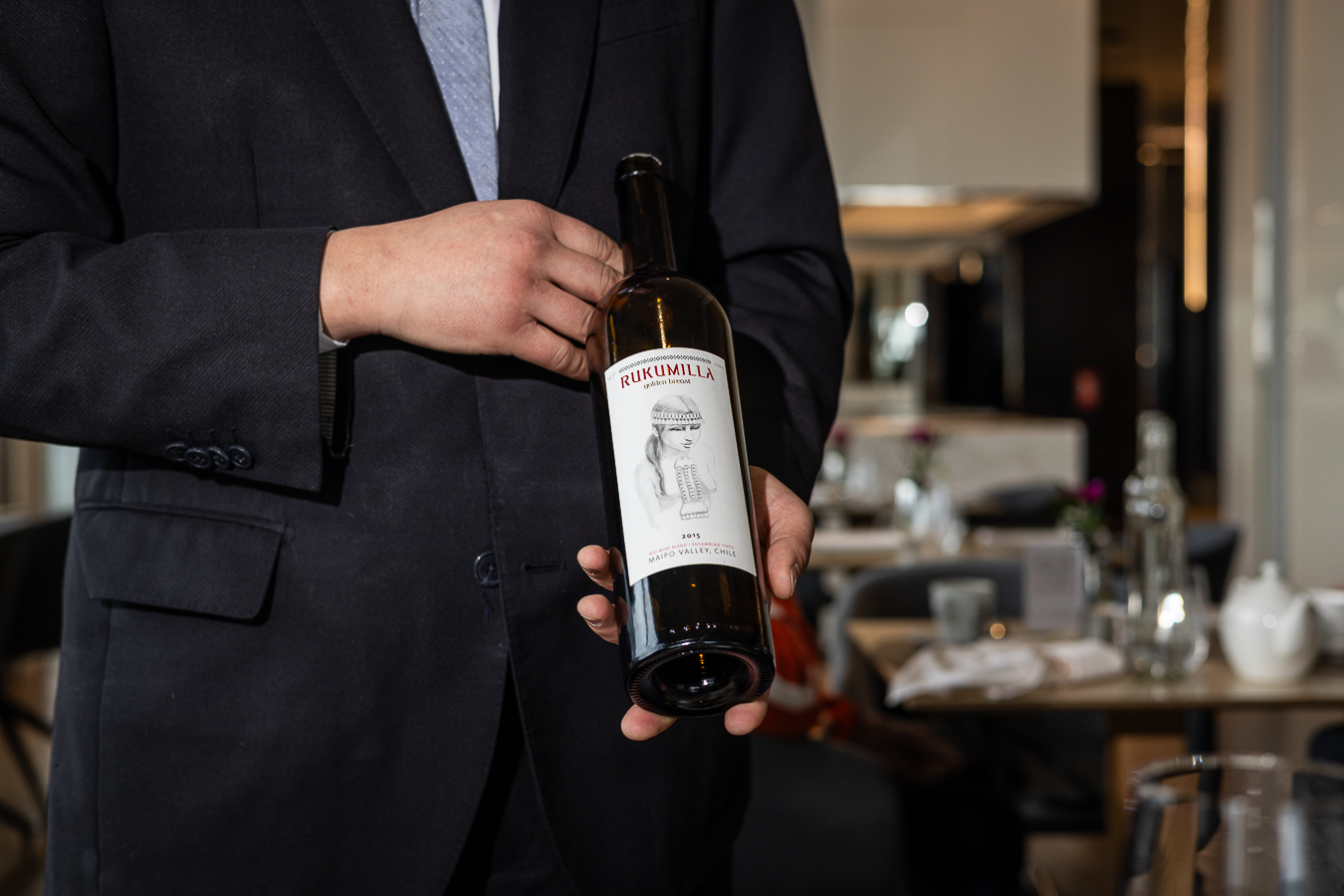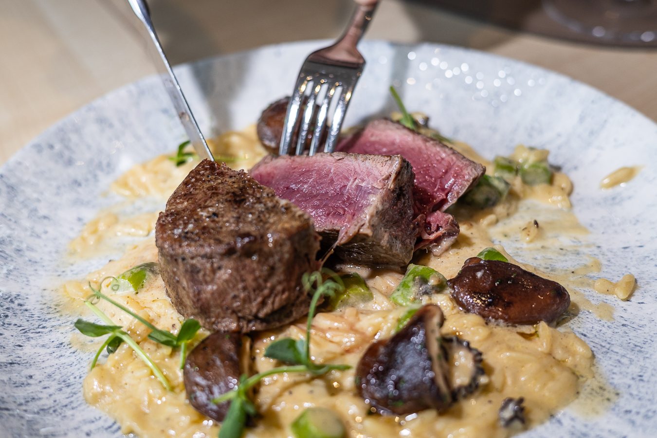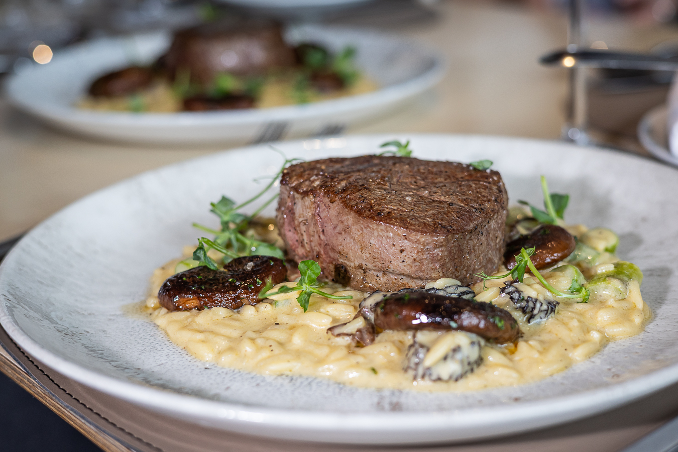 Para el plato de fondo, nos presentaron Rukumilla, un ensamblaje de Cabernet Sauvignon, Syrah, Malbec y Cabernet Franc para probar un filete de vacuno con salsa de pimienta verde y orzo cremoso con crema de queso trufada y hongos portobello y morchellas.