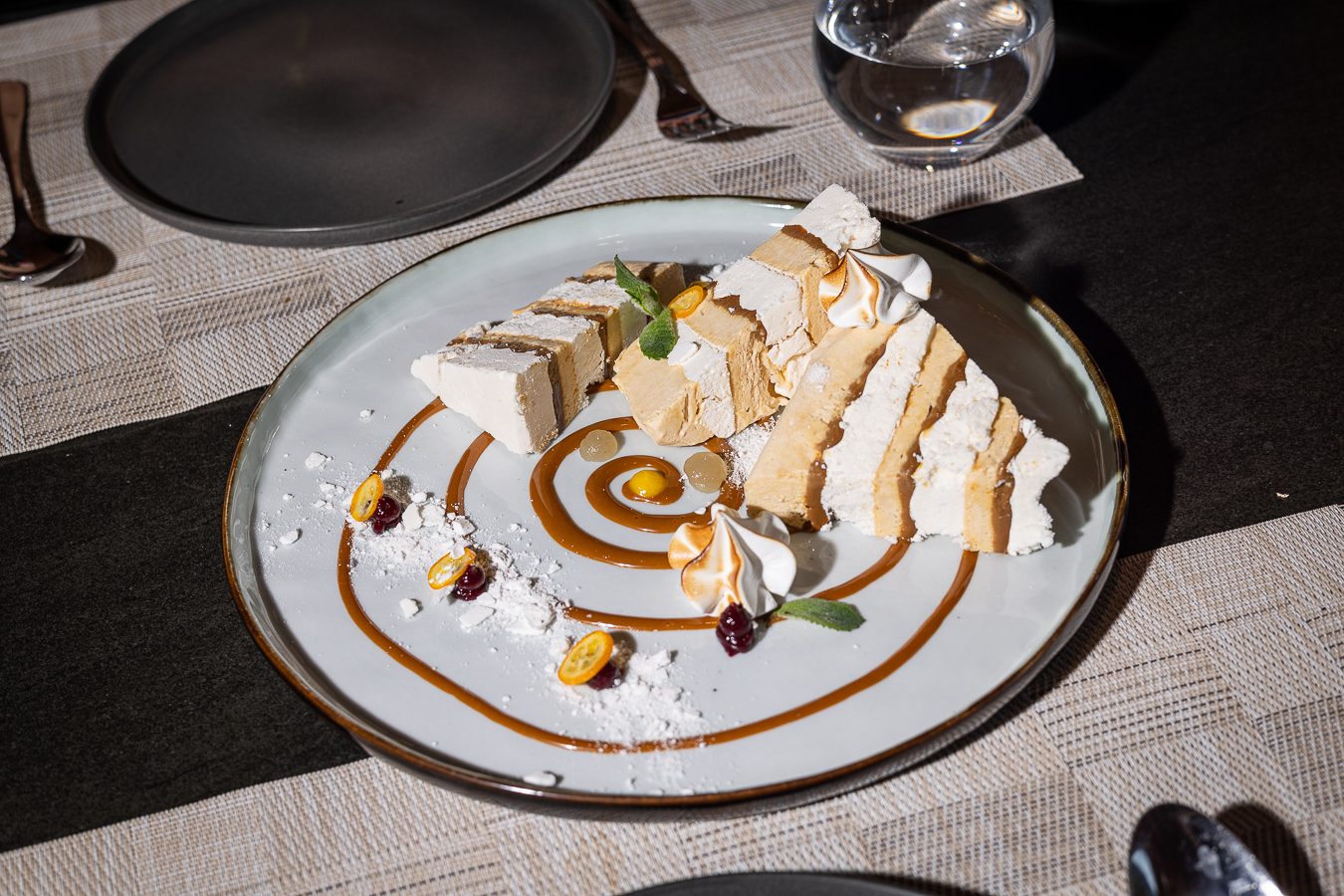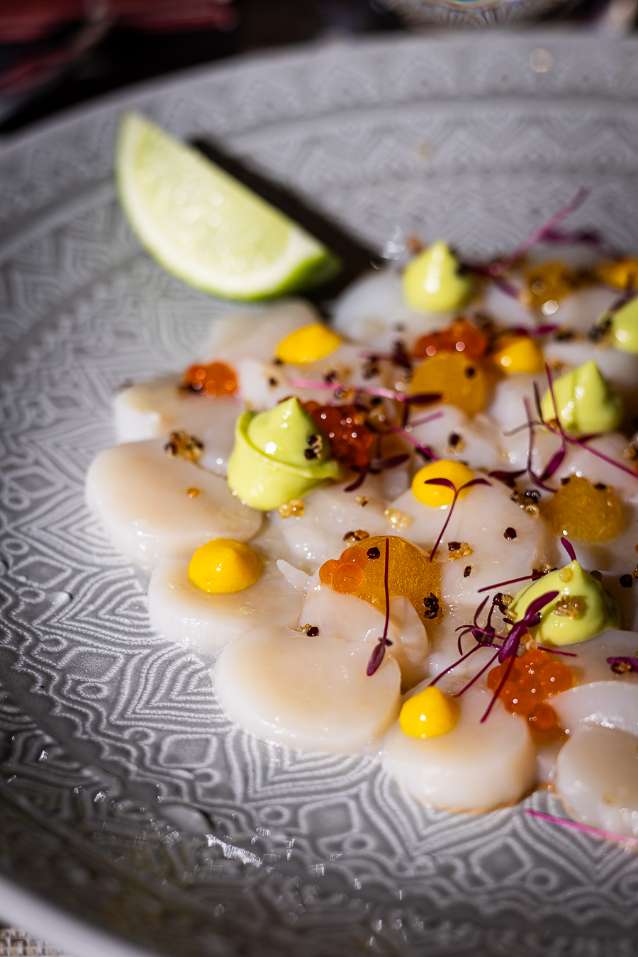 Probamos unos mockteles que valen la pena, sabores equilibrados y nada dulces, buen uso de los cítricos y buenas técnicas utilizadas. (Camelia Spritz y Valle Esmeralda) Los cócteles de autor, que serán 4 en total, se están desarrollando, ya tienen la base que es tener coctelería clásica y una carta de vinos bien seleccionada. De los cócteles presentados, el «Cielos de Limarí» más frutal con un amargor elegante, engañador porque se toma como jugo pero tiene potencia; y el Antu Kutral más dulce y cremoso que el anterior y es uno de mis recomendados, la galleta de mantequilla y jengibre activa más los sabores finales. (¡Muy bien Diego!)