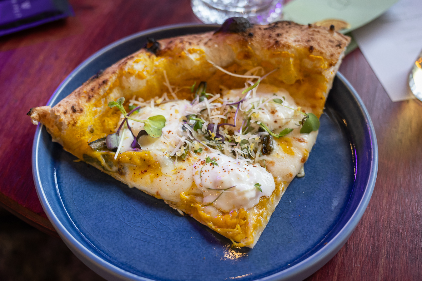 - Calabaza & Espárragos al Romero: Crema de zapallo asado al romero y aceite de ajo, fior di latte, espárragos salteados en ajo, stracciatella al limón, merkén y pecorino romano.