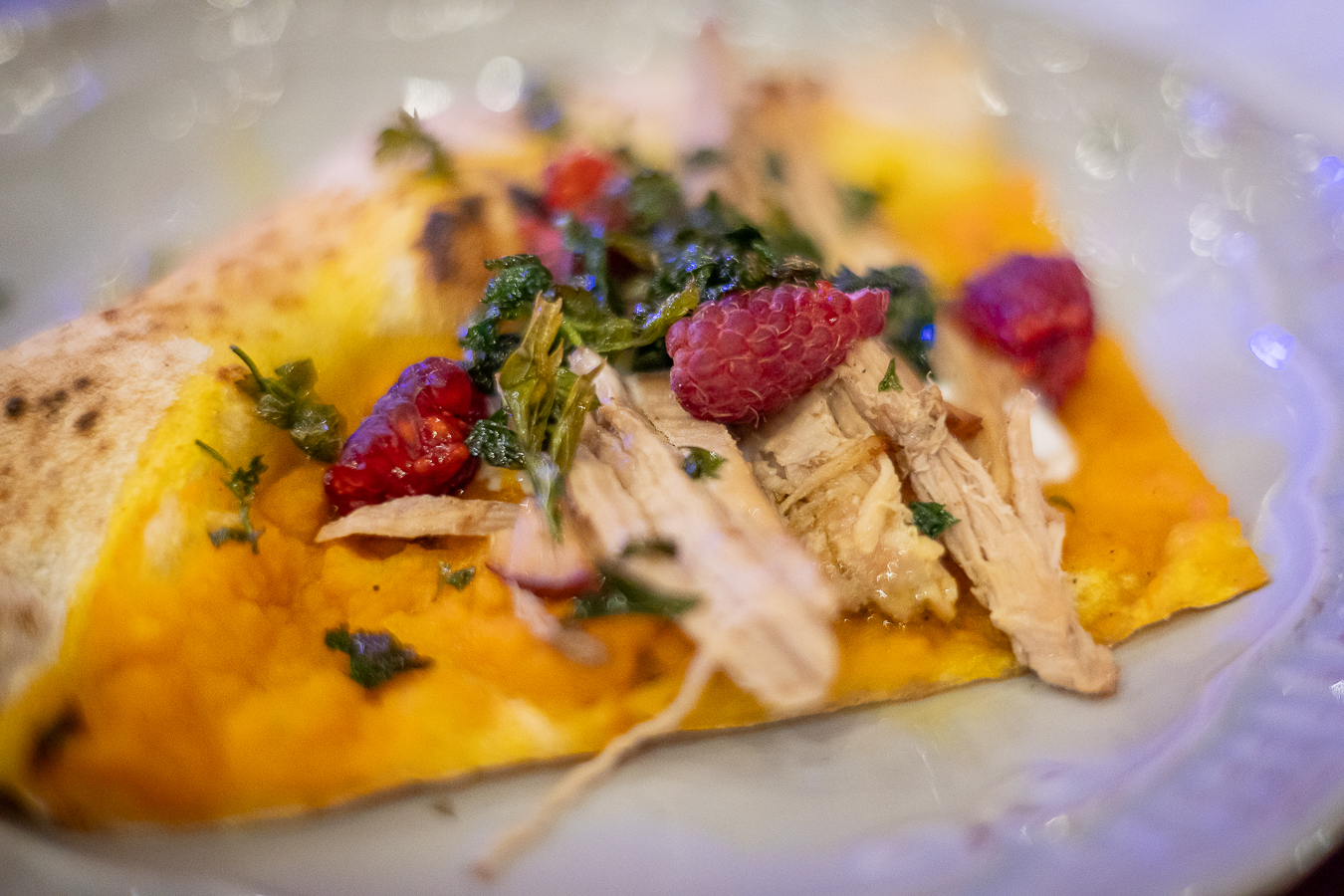 - Pulled Pork: Base blanca con stracciatella, pulled pork, calabaza y zanahoria asadas, frambuesas frescas y perejil.